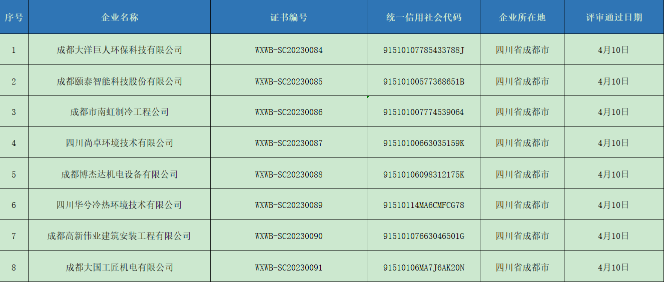 我會對第九批四川省制冷空調維修維保資格證書的申報材料組織了專家審查,現將符合專家審查意見的企業名單在四川省制冷學會門戶網站(http://www.xf1588.cn/)予以公示,以廣泛接受社會監督。公示截止日期為2023年4月13日。