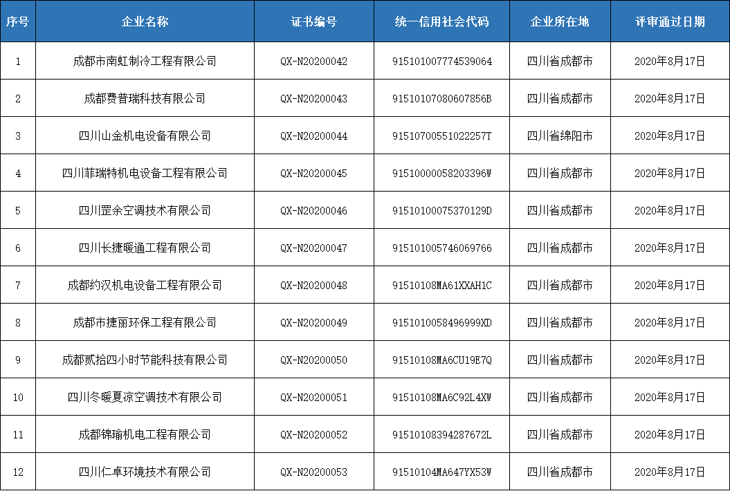 我會對第四批申請四川省空調通風系統專業清洗企業資質證書的申報材料組織了專家審查,現將符合專家審查意見的企業名單在四川省制冷學會門戶網站(http://www.xf1588.cn/)予以公示,以廣泛接受社會監督。公示截止日期為2020年8月20日。